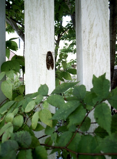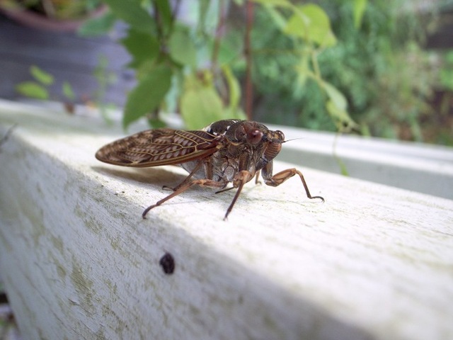 今朝も庭はセミの大洪水。鳴き声ばかりか、姿も目視で4匹は見えます。いちばん近くに見えるのは、どうやらクマゼミのようです。