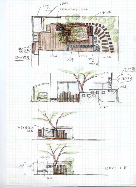 冒頭の写真は、このテーマの扉として選びました。左の写真がとりあえず完成した時点の庭です。右は、そのもととなったプラン図です。両者の間に要した時間は、ちょうど一年間でした。