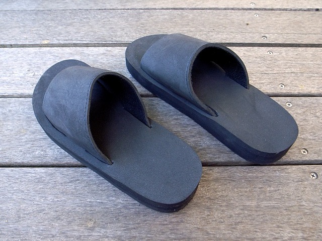 いままで、このサンダルについては何種類も試してみましたが、現状でのベストはアスクルのEVA(エチレン・ビニル・アセテート)製のサンダルです。デッキに置きっ放しでも水濡れや紫外線に強く、一足買いでも580円とお得です。足へのなじみもよく、犬の散歩で斜面を歩いた程度では脱げないほどのスグレモノです。このサンダルのおかげで、デッキの利用がいっそう快適になりました。