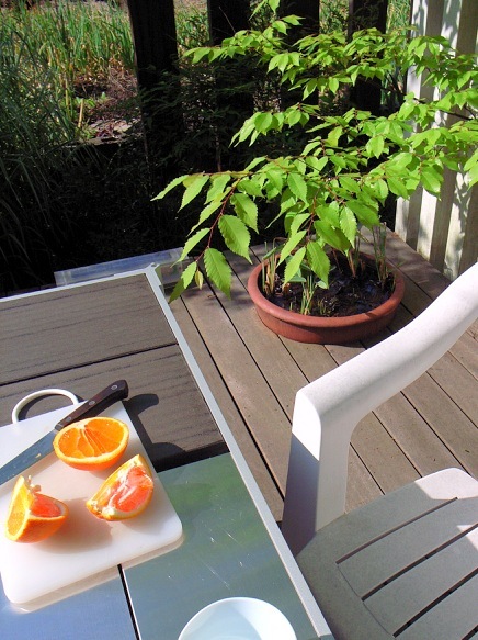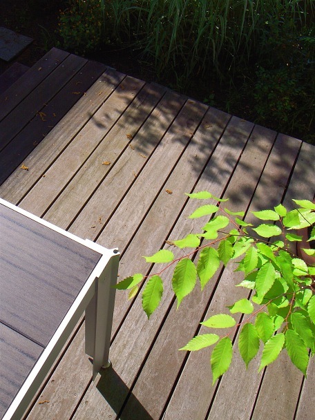 デッキは外部空間にありますから、砂ぼこりや樹液の落下、さらには鳥のフンや雨上がりの水などにも常にさらされます。このような場所で調理したり庭ゴハンも楽しむわけで すから、木の種類が何であろうと庭以上にデッキの清掃は必要です。
