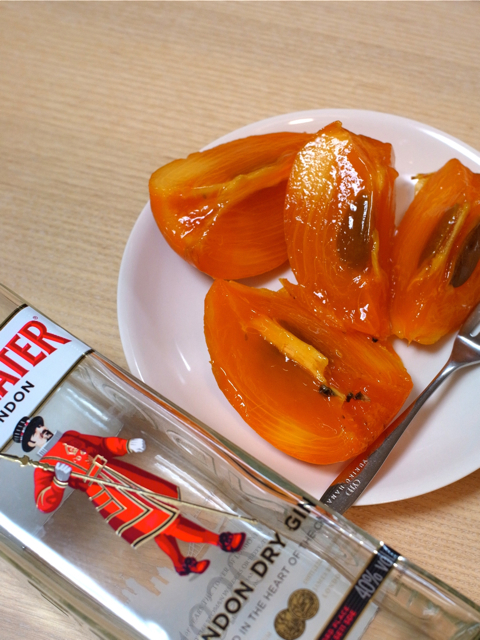 結果はトロトロの、ちょっと大人の甘いデザート。というのも、早く仕上げたかった妻が、こともあろうにビフィーターのジンを使ったせいです^^; ビフィーターは肉食いという意味ですが、これじゃあカキィーター^^