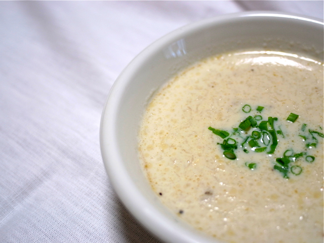 山芋と豆乳をベースに、ごま油で風味を加えた野菜のスープです。庭の食材は、庭のネギ。きっと、草も入っているよね^^