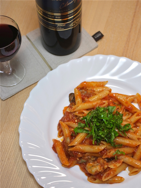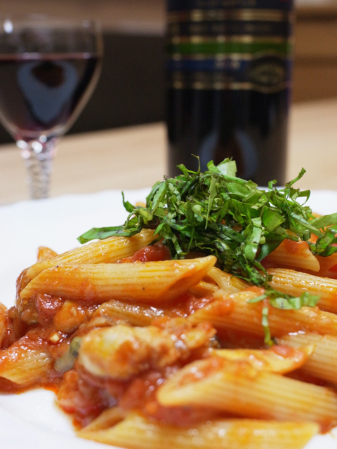 大好きなペンネのアラビアータを作りました。簡単にいえば、辛めのトマトソースですが、無花果のジャムを加えると美味しくできます。