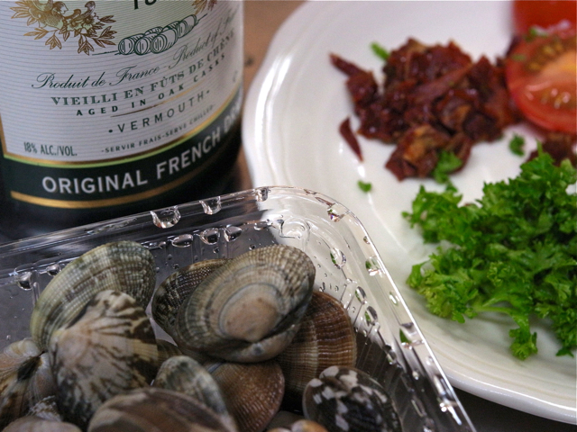 一般的には白ワインで蒸しますが、我が家ではベルモットを割って使います。この方がコクが出てプロっぽくなります^^ というか、ボトル入りのベルモットはさすがに消費量が少ないので、調理酒に転用するのが好都合というわけです。
