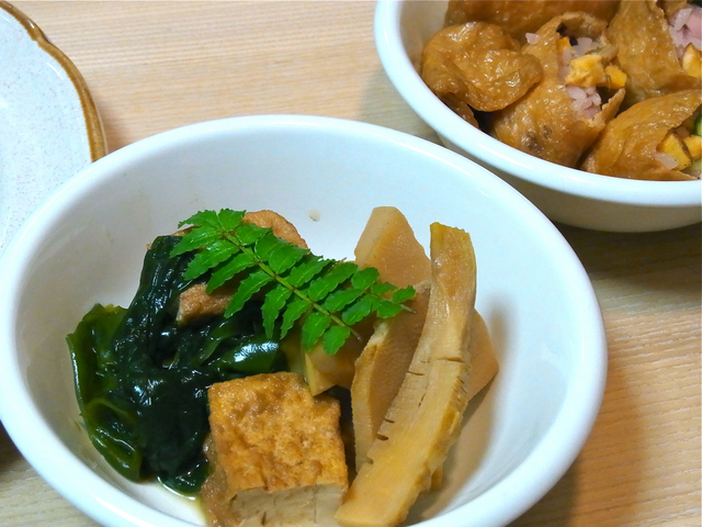さっそく、ワカメと厚揚げを加えてタケノコの煮物にしました。もちろん、サンショウの葉は庭に生えているものです。