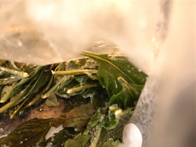 先日、その最後のひと掴みを使うことになりました。写真がそのときの様子です。右は保存中の冷凍庫のなかでジップロックを開けて撮影したもの。まだなんとなくバジルらしい色を止めています。