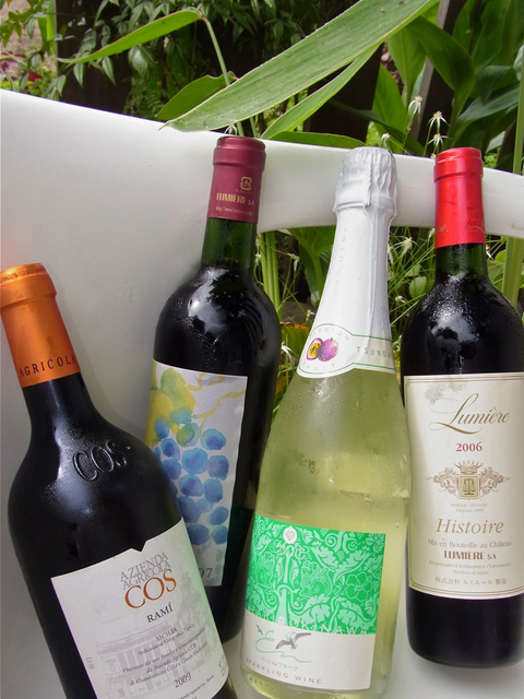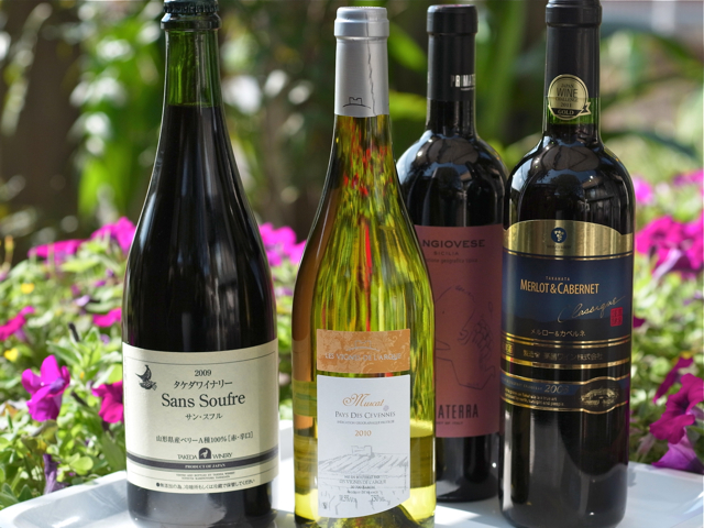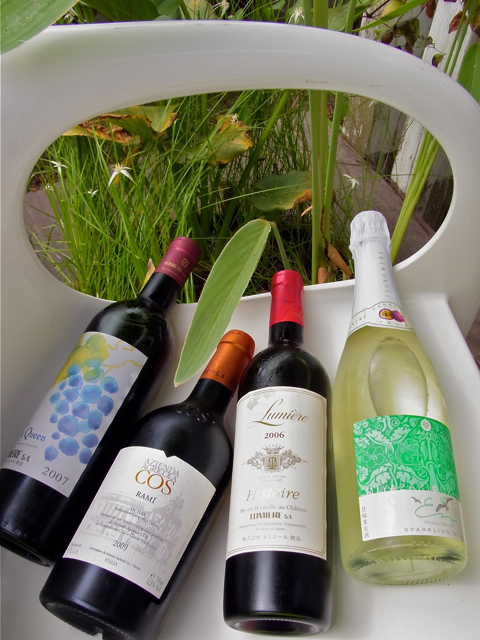 真ん中の二本はフランスとイタリアのもので、いずれも神田の柳屋さんの店頭で買い求めたものです。日本のワインの場合、店頭で手に取って選べるほど流通していないのが残念です。
