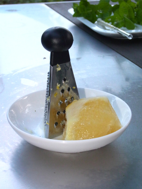 ところで、写真右下の道具ですが、仲間がフランス土産に買って来てくれたものです。小型の卸し金ですが、雰囲気が合いますね。摺りおろしているのは冷凍レモンです。本来ならライムですが、これも楽しく代用♪