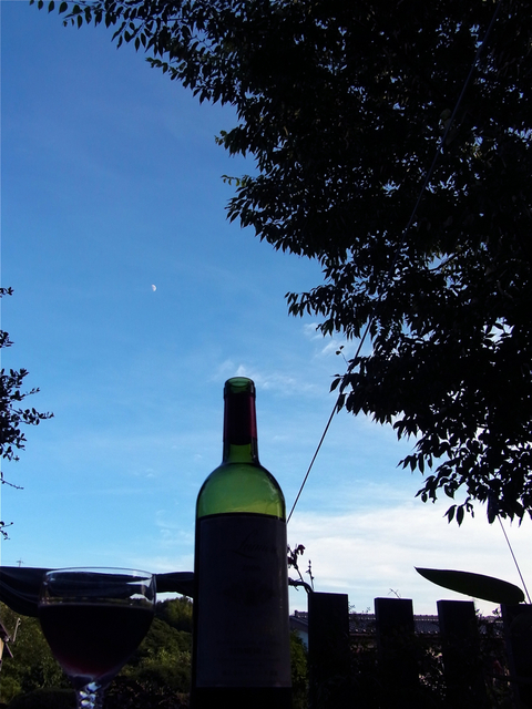 右上は、それから2時間を経過した18時の空です。すでにワインの1/3ほどがなくなっています^^。まわりの光量が落ち、陰が色濃くなると同時に空のブルーが深みを増し、南の空には、半月に輝く白い月がすっきりとした姿を見せています。