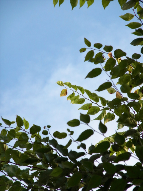 南の空が右上のような時刻でも、頭上(星座でいう天頂)の空はまだ明るく、左下のように西の山並みをかすめる低い位置から射した太陽の光が、高い位置にあるケヤキの梢を照らしたりしています。その一本の小枝だけが明るく輝く様子も、美しいと思う光景のひとつです。