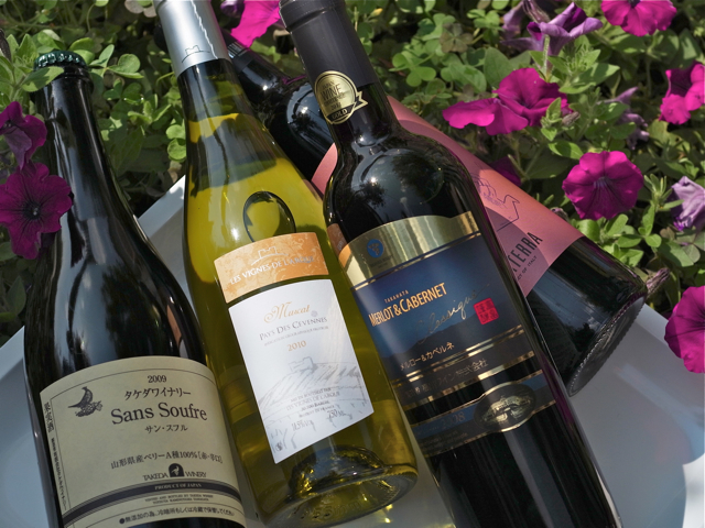 写真は最近購入したまとめ買いの例です。二本が日本のワインです。左端がタケダワイナリーのサン・スフル。デラウエア種で作られた少し発泡性のあるワインです。右端は高畠ワイナリーのメルロー種とカベルネソーヴィニヨン種を調合して作られた赤ワインです。