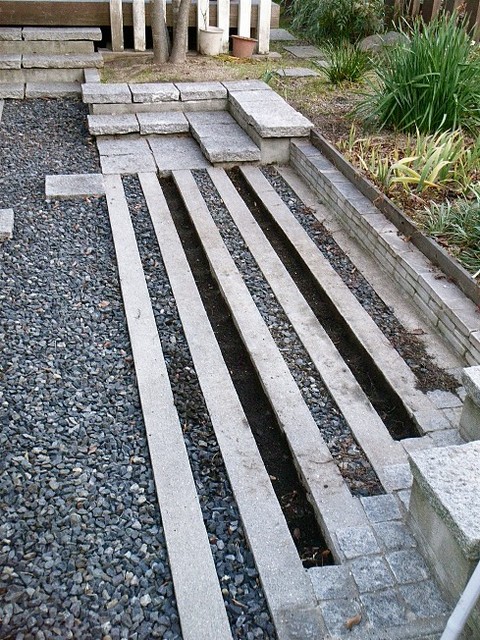 別テーマの「わが家の庭は100%手作り」に書きましたが、コンクリート格子の底は暗渠になっています。暗渠の粘度層とコンクリート格子の間はバラスが敷いてあり、排水しやすくなっています。そのため、溝に植物を植えるのも好都合です。