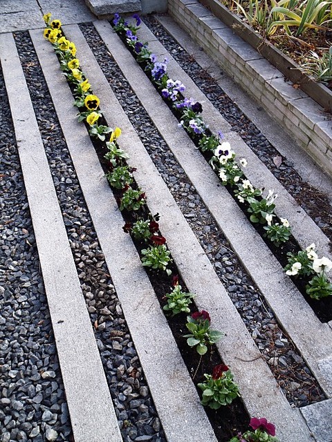 掃除で殺風景になったコンクリート格子の溝にパンジーとビオラを植えました。これは妻の仕事です。