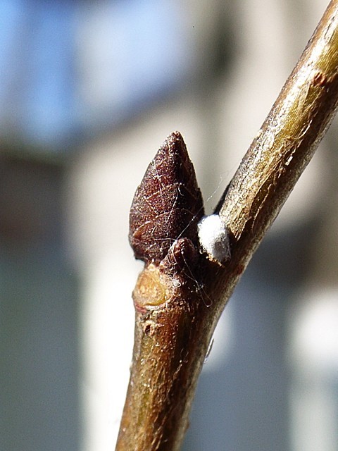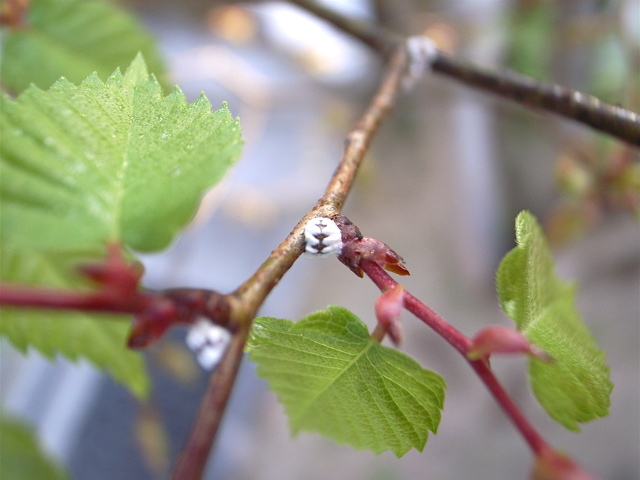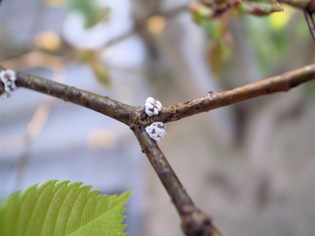 写真左はケヤキの新芽です。右は、枝の脇についているカイガラムシ。幹や太い枝に着いたカイガラムシはタワシで簡単に落ちますが、こういう小さな枝の脇の部分は指先やヘラで落とすしかありません。