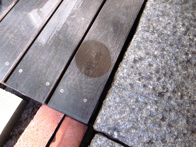 下段の右に、飛散したマシン油がデッキを白化させた様子を示します。丸い部分だけが物陰になり、マシン油が飛散していません。その周りが広範囲にわたってい白化している様子がわかります。