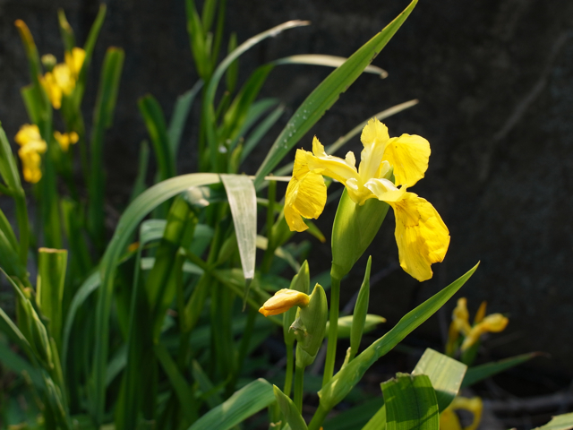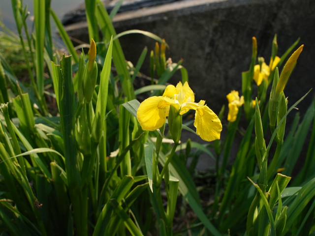 散歩道の水辺でキショウブを見つけました。たぶんはじめて。ショウブとしては珍しい色ですが「要注意外来生物」です。