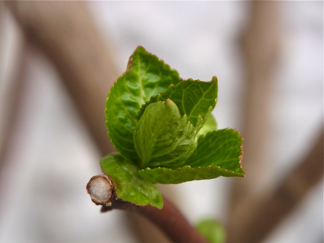 アジサイの若葉をマクロで撮ると、ボッテリと肉が厚くてちょっと意外。赤ちゃんの掌ががまんまるなのと同じかな^^