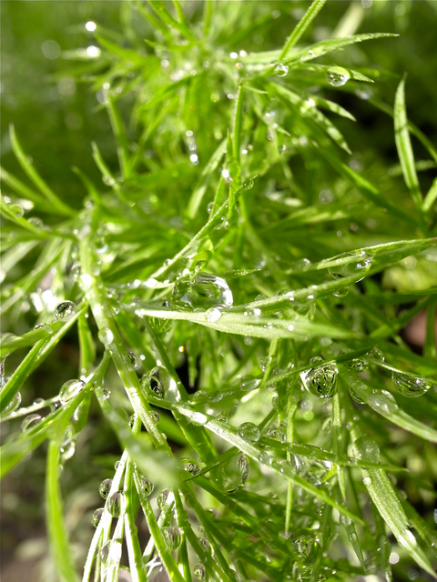 ニゲラって、独特の艶やかな花を咲かせますが、新緑の葉もなかなか魅力的です。とくに、雨上がりの雫を一杯にまぶして朝の光のなかでキラキラと輝く姿は、まるで繊細なジェリーといってもいいほど。