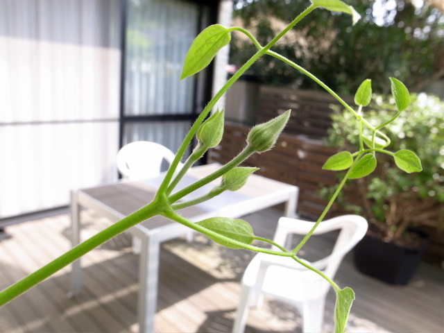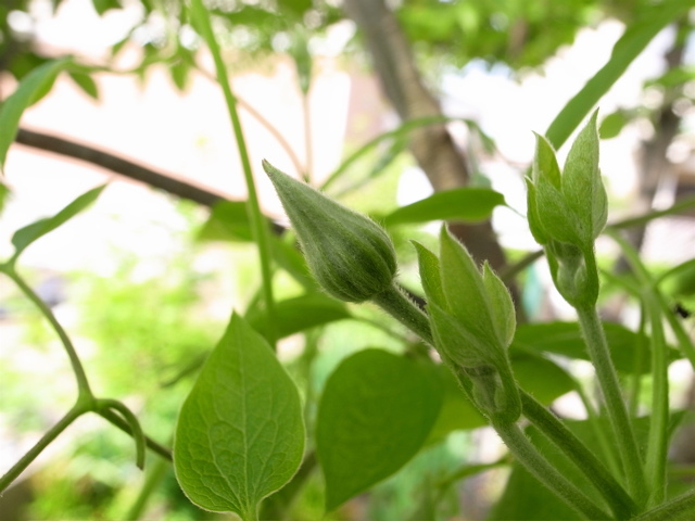 それに引き換え、我が家のテッセン(クレマチス)はまだ蕾。品種の違いもあるのでしょうが、ケヤキの下の半日陰のせいなのかな。