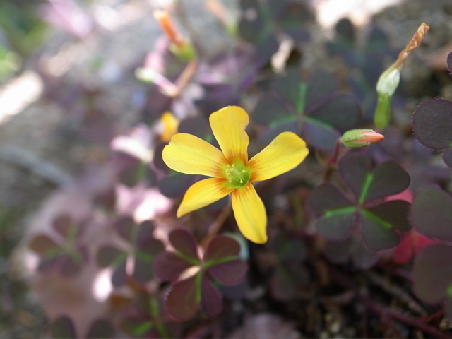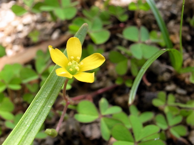 この時期、どこででも目にする黄色い小さな花、カタバミ。もちろん我が家の庭にもそこかしこに花を咲かせています。右の写真はアカカタバミ(赤片喰)です。