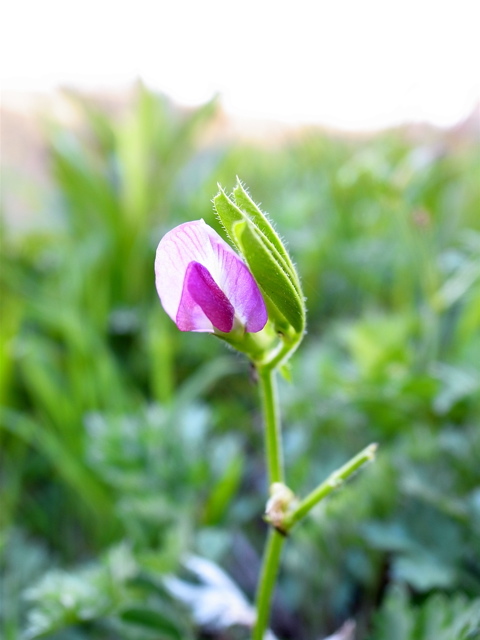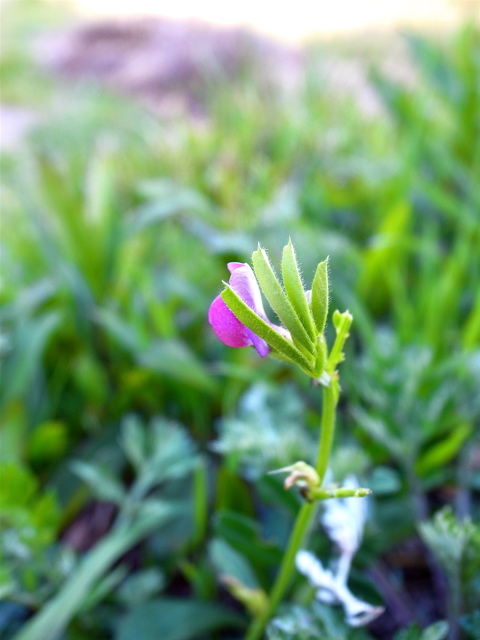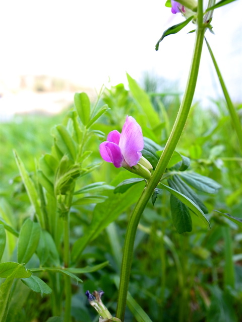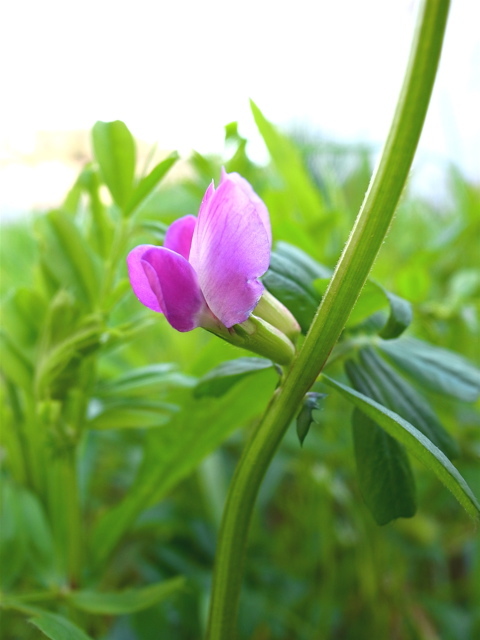 この季節、どこでも普通に目にするカラスノエンドウです。写真は、いましがた、散歩の途中で目にしたものです。