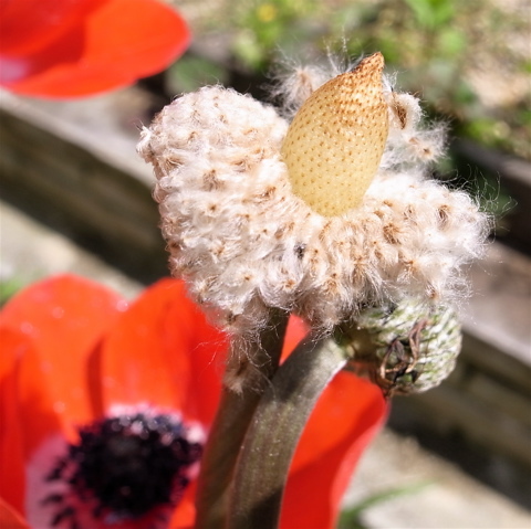 庭に放置していたアネモネの花が散り、朔果が割れて綿毛に覆われた種が出てきました。その一部はすでに風に運ばれて、どこか彼方へと飛んで行ってしまいました。