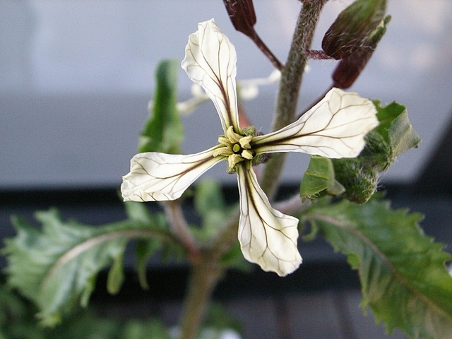 冬越えをしたルッコラに花が付きました。先日、外観と味から、なんとなくトウが立つのかなと思っていたら、あっという間に茎が伸びて花が咲きました。その早さにビックリ!