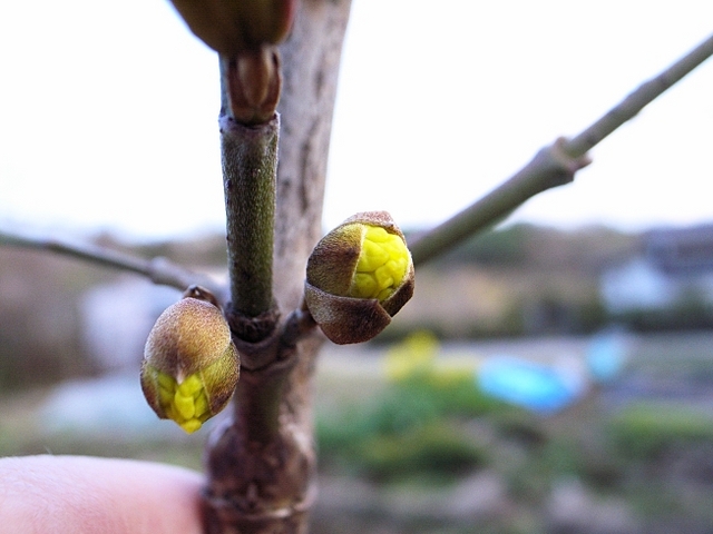固い実が割れて、黄色い花弁が少し顔を覗けました。線香花火のような賑やかな開花までもうすぐです。