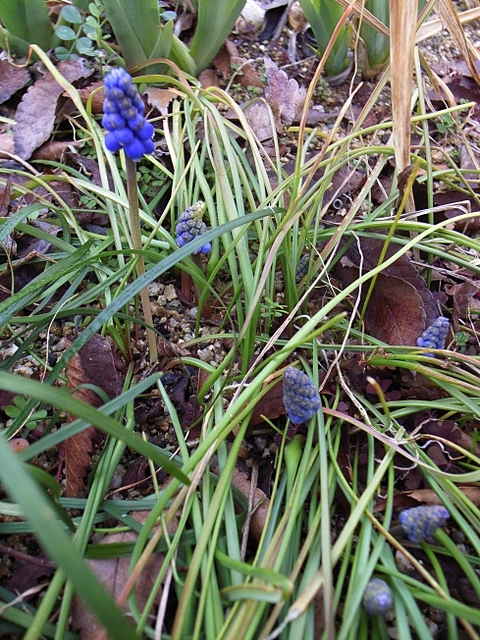 早朝、庭の草むらをかき分けると、ムスカリが顔をのそけていました。よく葡萄の房に例えられますが、草むらから頭を持ち上げている様子は、土筆の胞子にも見えます。