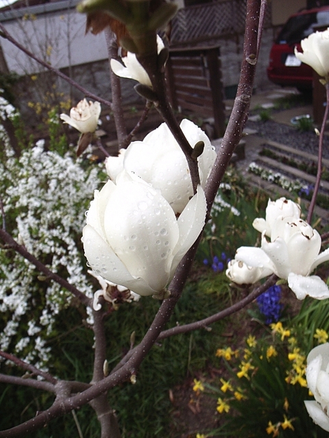 このモクレン、毎年蕾はできるのですが、昨年、一昨年とまったく花が付きませんでした。というより、花弁がのぞいたと思ったら鳥がついばむのです。柔らかいところから全部食べちゃう(>_<)。きっと、美味しいんでしょうね。