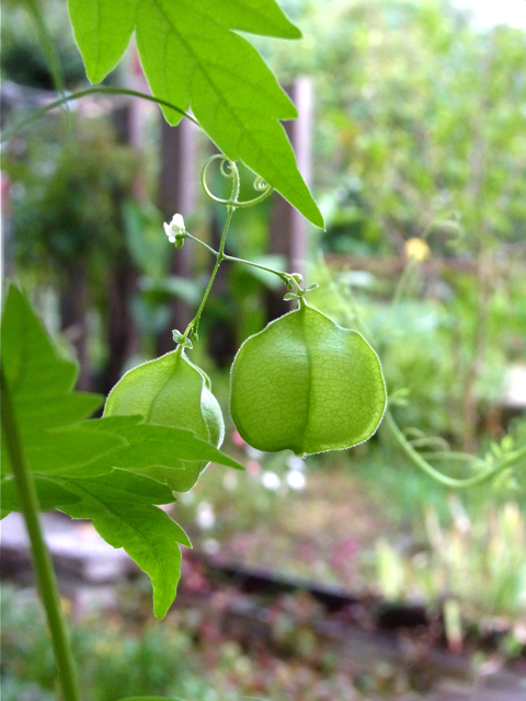 すでにこのコーナに何度か登場している庭のフウセンカズラがだいぶ大きくなってきました。とても涼しげで、いかにも日本の夏! 北米原産でも、こうして日本に心地よく馴染んでくれる植物をありがたく思うのは、ワタシの身勝手な都合なんでしょうね。