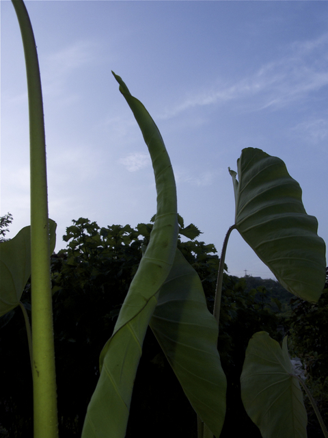 地続きのお隣さんの畑に、薄明かりのなかで茎と見まがいそうな里芋の葉を見つけました。この状態から雨傘のように開いてくるんですね。う〜ん、これもただただすごい^^