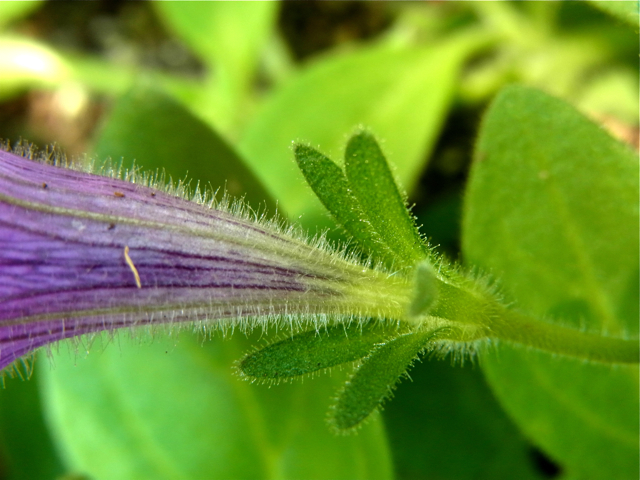 庭に咲いているサフィニア、あまりにも花が鮮やかで、花を直接撮ると赤紫の色が飽和して写真になりません。そこで、花の裏側はと見ると、実に繊細な繊毛で覆われています。これならバッチリ撮れそうとシャッターを押しました^^
