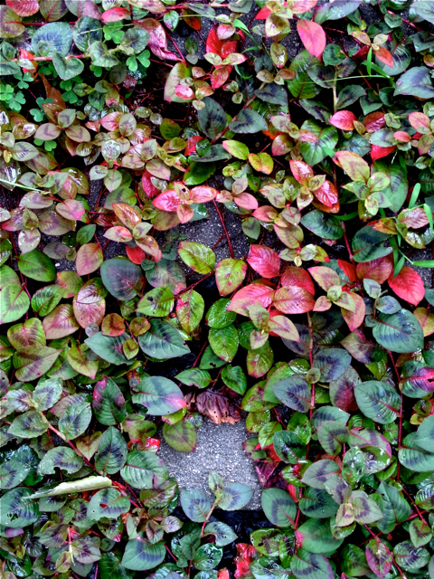 庭のジャリの上を覆い尽くすように育ったヒメツルソバです。もうこの季節になるとあのピンクの花はありませんが、紅葉して赤くなった葉と濃い緑の葉のコントラストがとても綺麗です。
