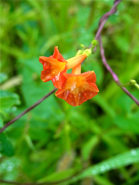 こちらはヒルガオより少し小ぶりの、コヒルガオです。花が開ききってなくて、雨粒に押されたか、なんとなく眠たそうな表情^^