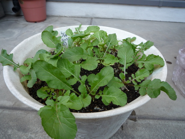 ルッコラ、若々しい葉ですね。我が家のルッコラは、採取した種で育てた二世です。夏頃には別コーナでしばしば登場していましたが、いまは現役を引退。それでも立派に生きています(写真)。さすがに春夏のようには食べられませんけどね。