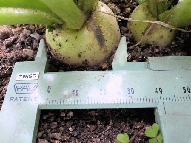 キャベツ、カリフラワー、ミニダイコン、セロリのそれぞれの様子はどうでしょう。キャベツは少し巻きはじめたかな。カリフラワーは、先週の真っ白の花蕾が少し黄ばみ大きくなりました。ダイコンもじりじりと大きくなっています。セロリですが、小さいながらもなんとかセロリらしい葉の形が見えます。