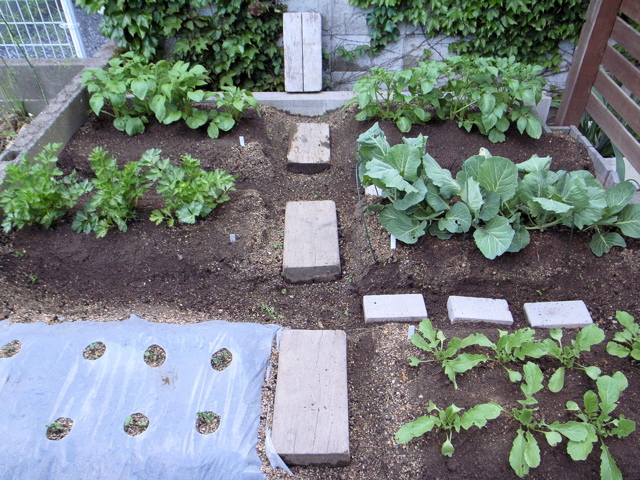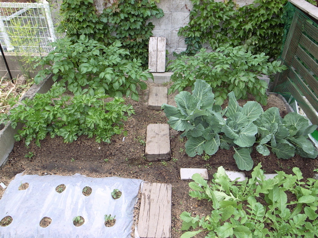 ジャガイモの芽かき、草取り、掃除をすませた本日の一坪菜園の様子です。ジャガイモ、セロリ、キャベツ、ミニダイコン、オクラ。みんなしっかり大きく育ってね。