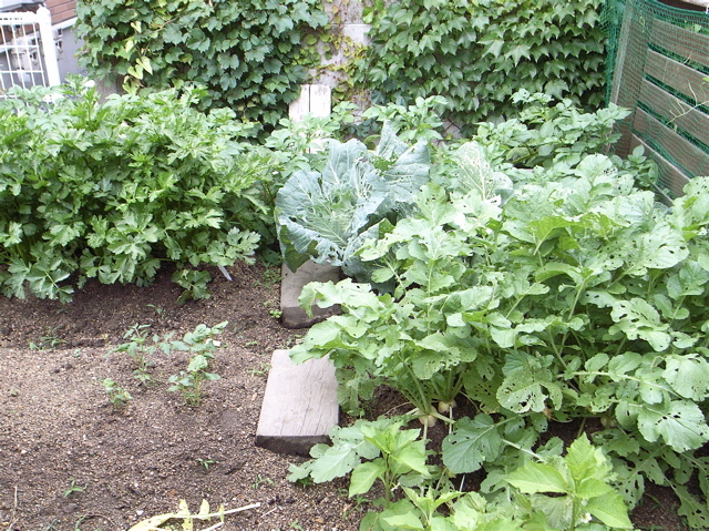 まず、一坪菜園の全景ですが、そうとうに茂ってきました。ヒヨドリの襲撃を生き延びたキャベツは、結果的には密植状態。ミニダイコンも二株で育てているせいで、かなり込み合っています。