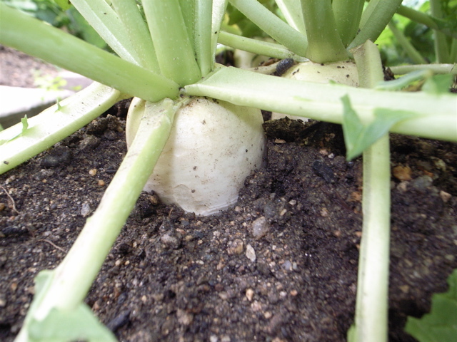 品種ごとに見ると、キャベツはなんとか巻きはじめていますが、巻きが弱いというか、遅いという感じ。ミニダイコンは、地面から少し顔を出している状態から太さ3〜4cmくらいに育っていそうです。