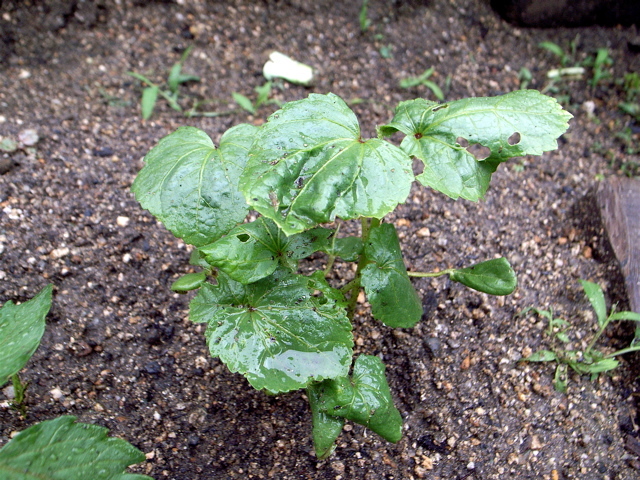 虫食い被害は、プランターよりこちらの方が多いですね。10日間での多発した葉の穴にしばしボーゼン。とはいっても、頭のなかで10日間というおおきなコマ落ちを補正、「10日のうちに徐々にこうなったんだよな〜」と加熱した頭をクールダウン(笑)。