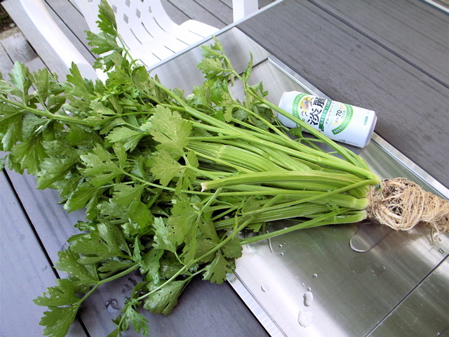 菜園のセロリを眺めてると、色といい姿といいかなり成長しています。このまま次の休日まで放置するとスが入る心配もあります。まずは様子見ということで、一株を収穫しました。
