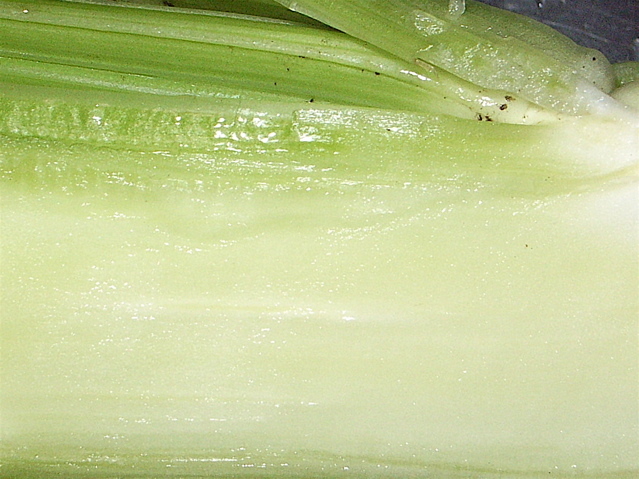 中身はどうなんだろう? キッチンで繊維に沿って包丁を入れ、茎の内部を見てみました。水分がじわ〜っとにじみ出てきます。よく観察すると、軸芯あたりにほのかに白い筋ができています。たぶん、時間が経つとこれがスになるのでしょうね。