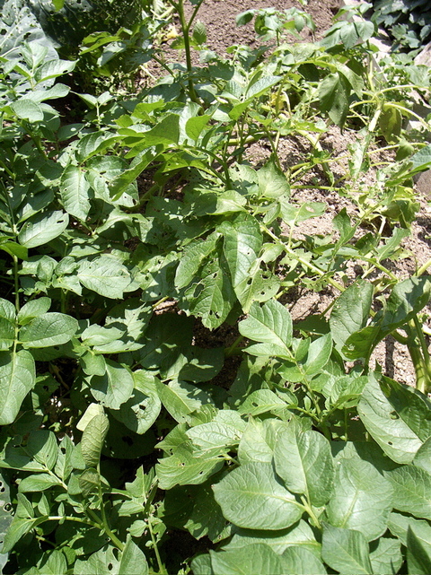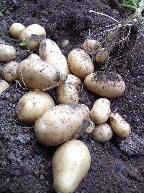 こちらも、まだ二週間くらいは早いと思いますが、近隣の菜園のペースに引きずられて、二畝のうちの半分だけを収穫してみました。品種はシンシア。写真右が、掘らずに残した畝です。