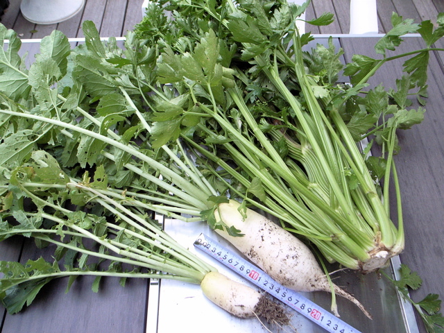 ミニダイコンとセロリを収穫しました。ダイコンは二回目、セロリは三株目(最後)です。