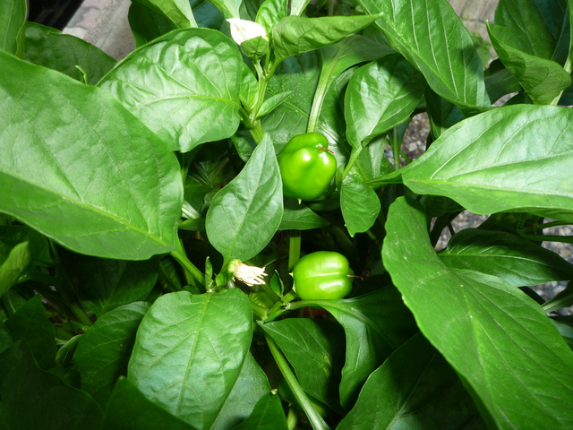 鉢ごと倒れていたピーマンは、そろそろ花から実に変わる
