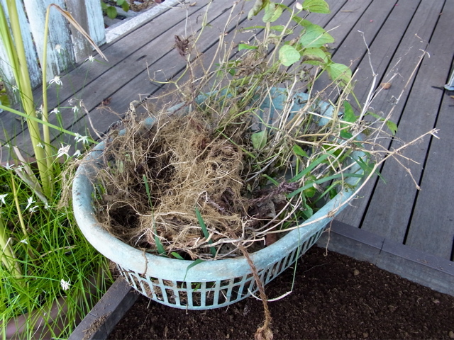 これらを混ぜる前に、収穫の終わった茎や根を取り除き、石やゴミも除去します。写真のカゴに入っているのが今回除去したゴミです。