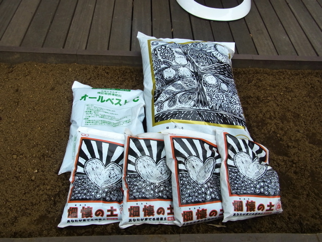 追加する「懐」の推奨使用量は「畑」ひと袋(12リットル)に「懐」一袋(1リットル)です。しかし、「懐」が高価で懐が寒いので(笑)半量の5袋とし、代わりに手元にあった「畑」一袋を追加することにしました。肥料は「オールベストC」ひと袋です。