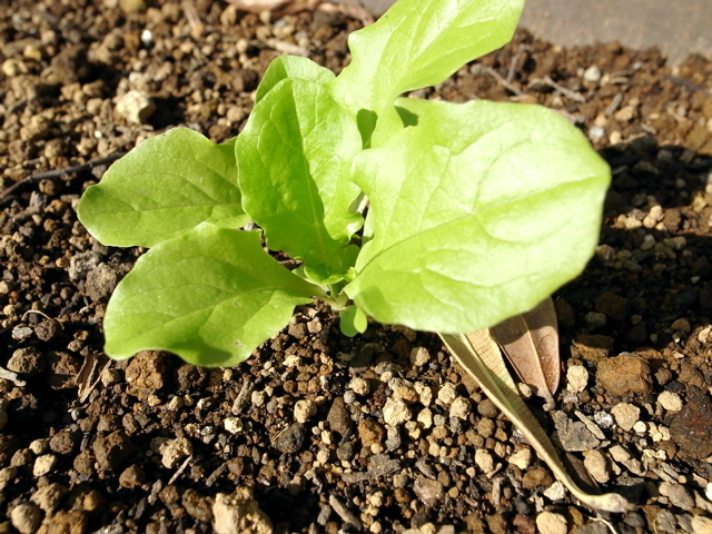 こちらのプランターはさんざんのスタートです。種が(たぶん)コガネムシの幼虫に食われ、生き延びたチマサンチュはひと株というありさま。でも、そのひと株が何とか健闘しています。