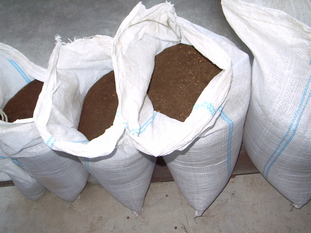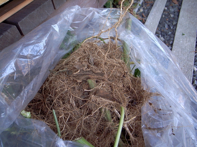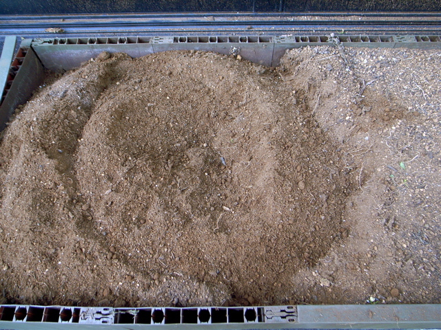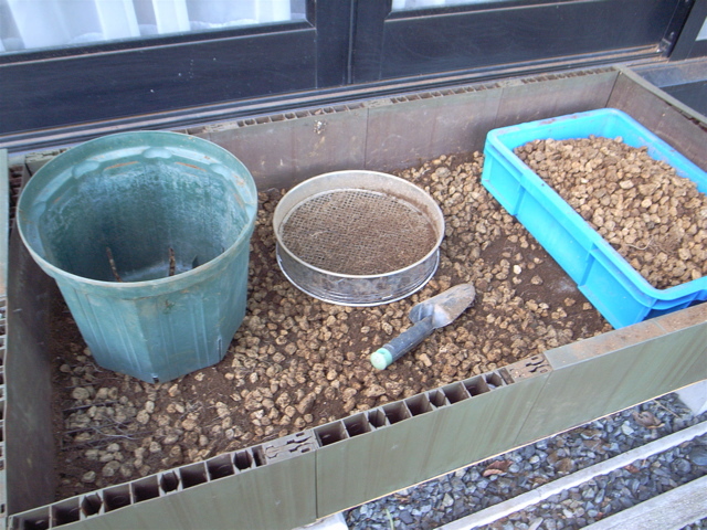 なんとも万事休す。手抜きはあきらめ、フルイでゴミを取り除きながら土を選り分け、いったんきれいになった土を土嚢袋に詰め新しいプランター枠に移すことにしました。